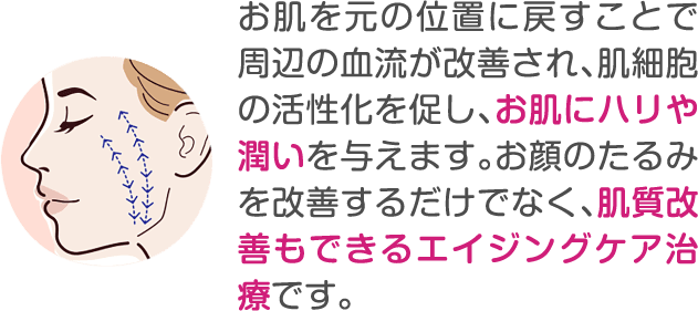 お肌を元の位置に戻すことで周辺の血流が改善され、肌細胞の活性化を促し、お肌にハリや潤いを与えます。お顔のたるみを改善するだけでなく、肌質改善もできるエイジングケア治療です。