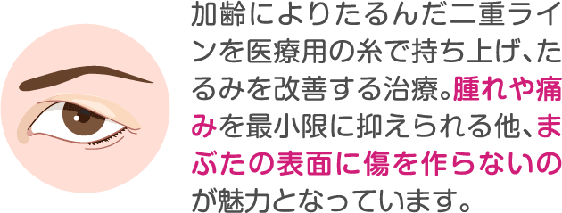 加齢によりたるんだ二重ラインを医療用の糸で持ち上げ、たるみを改善する治療。腫れや痛みを最小限に抑えられる他、まぶたの表面に傷を作らないのが魅力となっています。