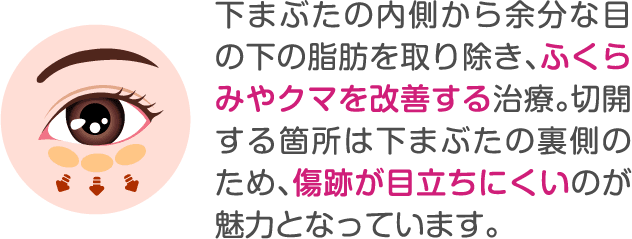 下まぶたの内側から余分な目の下の脂肪を取り除き、ふくらみやクマを改善する治療。切開する箇所は下まぶたの裏側のため、傷跡が目立ちにくいのが魅力となっています。