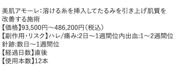 美肌アモーレ:溶ける糸を挿入してたるみを引き上げ肌質を改善する施術 【副作用・リスク】ハレ/痛み:2日~1週間位 内出血:1~2週間位 針跡:数日~1週間位 【経過日数】直後 【使用本数】12本
