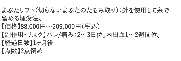 まぶたリフト(切らないまぶたのたるみ取り):針を使用して糸で留める埋没法。 【副作用・リスク】ハレ/痛み:2~3日位。内出血1~2週間位。 【経過日数】1ヶ月後 【点数】2点留め
