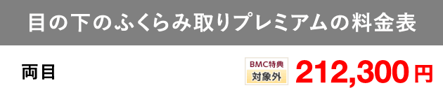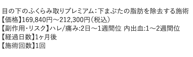 目の下のふくらみ取りプレミアム:下まぶたの脂肪を除去する施術 【副作用・リスク】ハレ/痛み:2日~1週間位 内出血:1~2週間位 【経過日数】1ヶ月後 【施術回数】1回