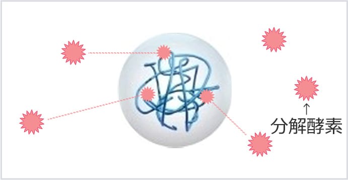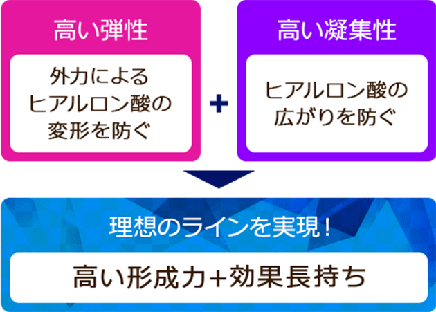 高密度・高濃度の性質を持っているのでヒアルロン酸が遅いスピードで徐々に吸収されます。また、ヒアルロニダーゼ(ヒアルロン酸を分解する酵素)に強いため約1年~1年3ヶ月程度の長い持続性を期待できます。
