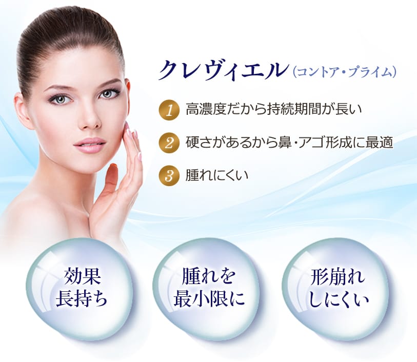 クレヴィエルは、高密度・高濃度のヒアルロン酸で、鼻やアゴなどの形成やお顔にメリハリ感を出したい方に適しています。