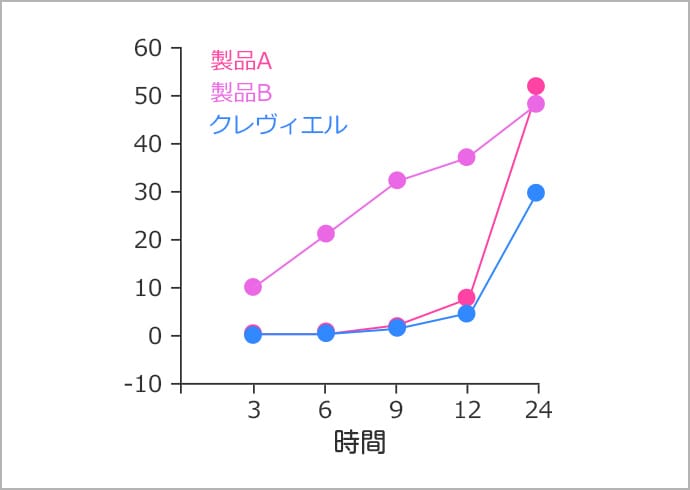以下のグラフはクレヴィエルと他2つのヒアルロン酸の腫れをマウス実験により比較したグラフです。クレヴィエルは他ヒアルロン酸に比べて腫れにくいことが分かります。