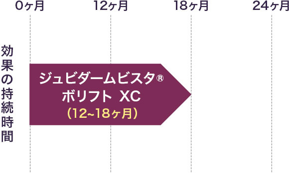 ボリフト XCは、ジュビダームビスタ®シリーズのヒアルロン酸です。ジュビダームビスタ®のなかでも質感がなめらかで、浅いシワや細かいシワに効果的です。持続期間は12ヶ月~18ヶ月ほどと、長持ちするのも特徴です。