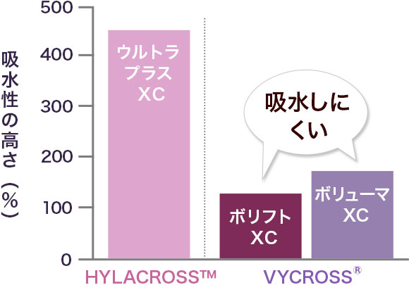ボリフト XCはVYCROSS®技術を使用して生成されており、体に吸収されにくく、むくみづらい「低吸水性」を実現しています。また、注入後に変形しづらいため仕上がりの自然さを維持できるメリットもあります。