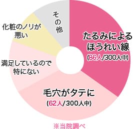 当院で行ったアンケートによると、30代以降の女性の約30%が「ほうれい線で悩んでいる」と答えたことが分かりました。また、約21%の方が「(たるみによって)縦方向に伸びる毛穴に悩んでいる」と答えています。