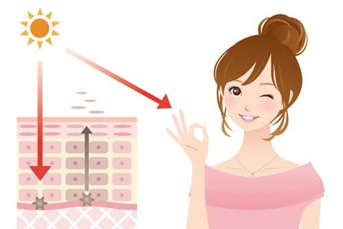 私たちの皮膚は、紫外線を受けると、メラノサイトからメラニン色素を作りだします。メラニン色素には、肌を防御して、肌細胞が紫外線の刺激を受けないようにする働きがあります。シミの原因として嫌われがちなメラニン色素ですが、実は、紫外線を吸収して肌を守る最も重要な役割が備わっているのです。
