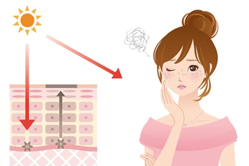 産生されたメラニンは、通常、肌のターンオーバー(新陳代謝)によって、4週間ほどで表面の角質とともに剥がれ落ち、垢になって排出されます。ところが、長年、紫外線のダメージが肌に蓄積されると、メラニンが過剰に作り出され、ターンオーバーでは排出しきれなくなります。