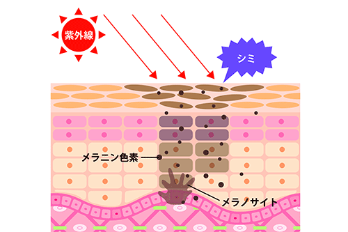 紫外線を浴びることによりメラノサイトと呼ばれるメラニンを生成する組織が活性化し、メラニンがターンオーバーの過程で肌表面に押し上げられてシミとなって現れます。