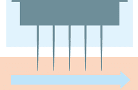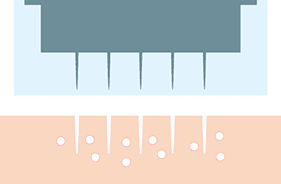ドラッグデリバリーシステムとは薬剤を、適切な場所へしっかり届ける仕組みです。極細のマイクロニードルを使用し痛みが軽減できると同時に、皮膚表面に塗布した薬剤をしっかりと均一にムラなく真皮層まで届けることが可能です。