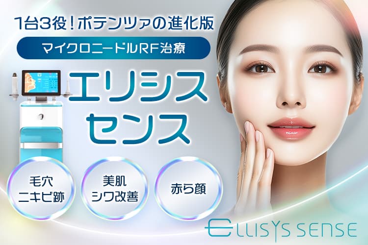 エリシスセンスはニキビや小ジワなど、複数のお悩みを抱えた方におすすめです。一度の治療で3つの効果が得られ、針治療特有の内出血や赤みなどのダウンタイムも少ない新しい治療です。