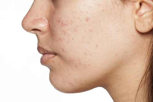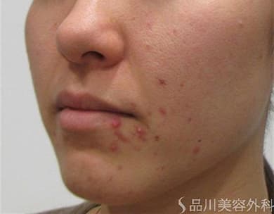 アクネ菌が産生する物質によって、毛穴の上皮細胞が破壊されて真皮を刺激する事により炎症が起こり、皮膚が赤く見えます。これが紅色丘疹(こうしょくきゅうしん)=赤ニキビの状態です。こうなってしまうと、跡が残ってしまう可能性が出てきます。