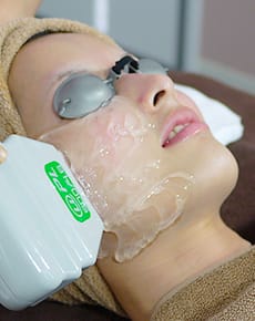 まずは冷たいジェルをお顔にのせて、ジェルを全体に伸ばします。施術中も適宜ジェルを追加してから、機器を使い光を照射します。最後にジェルをふき取ったら終了です。