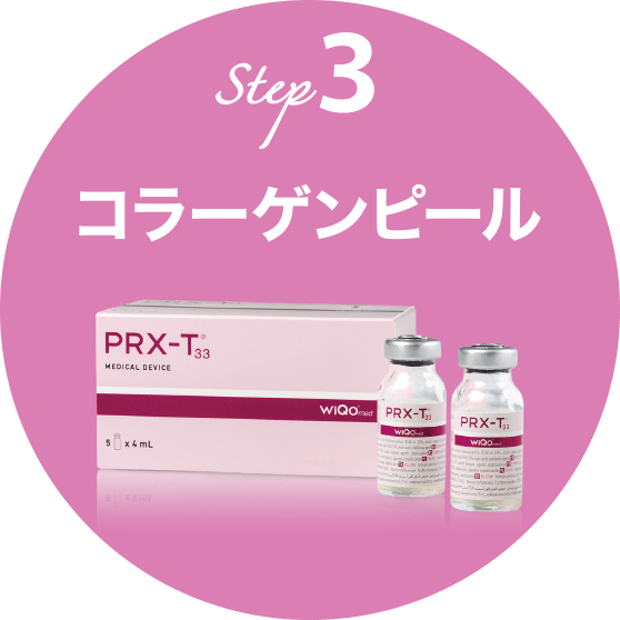 コラーゲンピールは高濃度トリクロロ酢酸(TCA)と低濃度過酸化水素(H2O2)とコウジ酸を主成分とする薬剤「PRX-T33」を皮膚に塗布して、線維芽細胞を活性化させることでコラーゲンの生成を促進します。直後から肌がツルツルになり、次第にハリ感・弾力を取り戻します。
