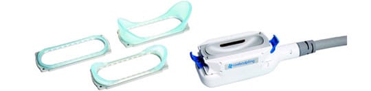 施術時は特許取得の「0度以下になっても凍ることがない特殊なゲルパッド」を皮膚に貼り付け、その上から機器を装着して冷却します。